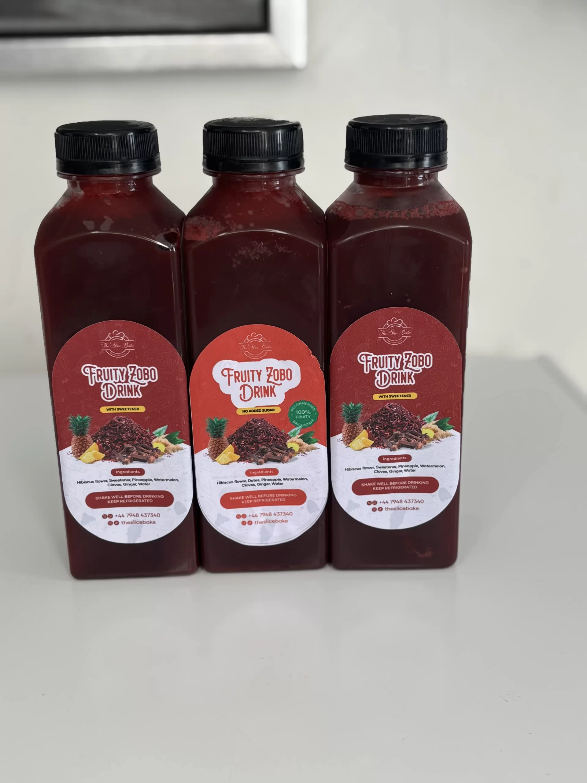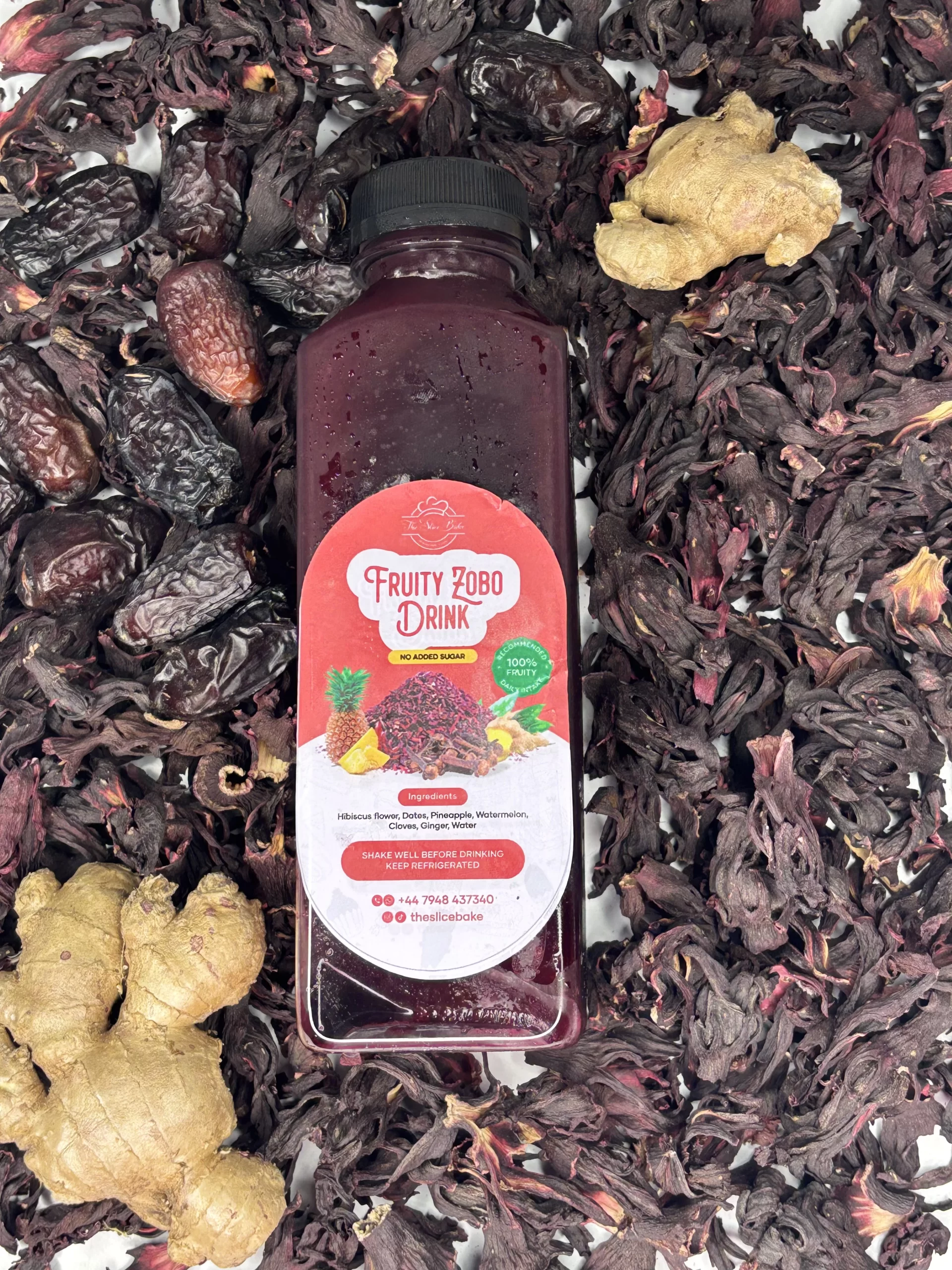 Hibiscus flower (zobo leaves), pineapple, watermelon, ginger, sweetner/date, water, cloves.